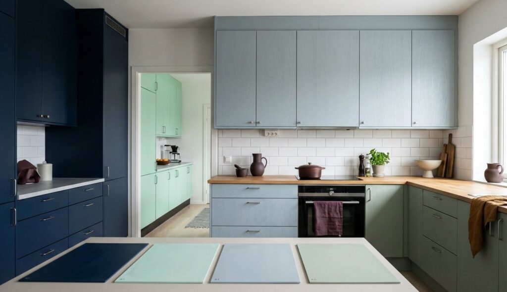 Les contrastes trop froids rigidifient les volumes. Le bleu marine sur meubles paraît, en revanche, trop nautique et rapidement daté aujourd’hui. Le vert menthe synthétique évoque, pourtant, des cuisines rétro plutôt que des espaces intemporels. Un bleu ciel grisé apporte, donc, de la fraîcheur sans rigidifier les volumes contemporains. Un vert sauge feutré s’accorde, à ce titre, aux bois clairs et apaise durablement.