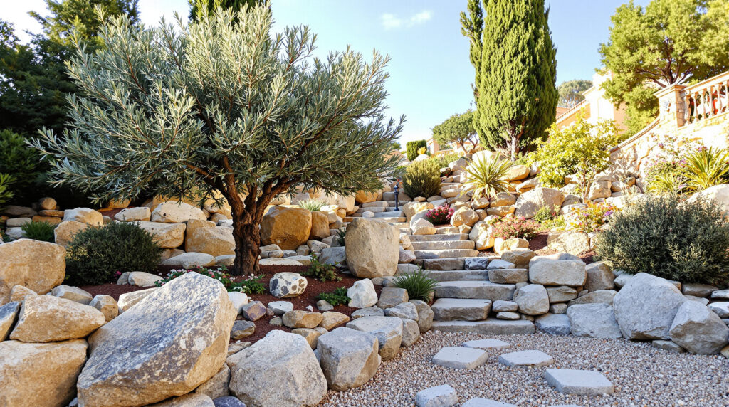 Pour sublimer l’olivier, disposer des pierres calcaires autour du tronc apporte un côté provençal. Ainsi, cette rocaille surélevée accélère le drainage et évite les racines asphyxiées. Par conséquent, le feuillage gris-argent s’avère encore plus lumineux sous l’ardeur du soleil. En comparaison, un simple paillage organique retient trop d’humidité et nuit souvent à l’arbre.