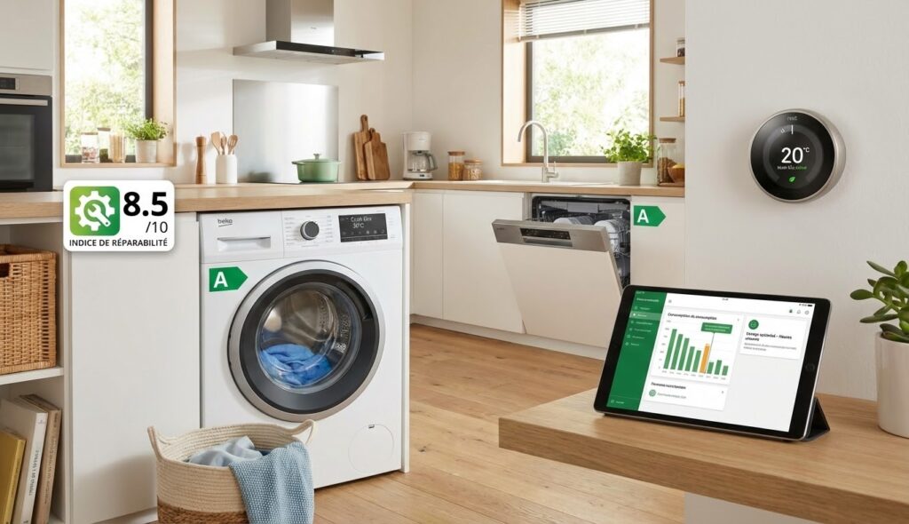 L’intelligence embarquée sert l’efficacité mesurable, car les capteurs ajustent cycles, durée et température automatiquement. Les étiquettes énergie, dès lors, facilitent le repérage d’appareils sobres classés de A à G. Le pilotage connecté, en d’autres termes, déclenche les programmes aux heures creuses et signale l’entretien. Un foyer type, par conséquent, optimise eau, électricité et durée de vie en limitant l’usure.
