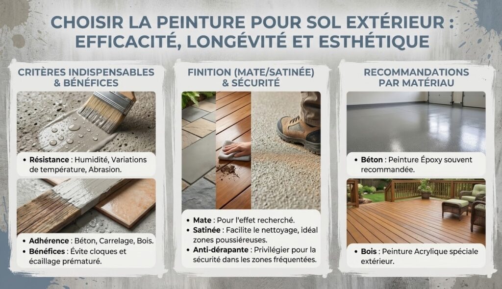 Le choix de la peinture conditionne directement l’efficacité et la longévité du revêtement. En effet, une peinture spéciale sol extérieur est indispensable car elle résiste à l’humidité, aux variations de température et à l’abrasion. Cette peinture doit aussi présenter une bonne adhérence sur des surfaces variées comme le béton, le carrelage, voire le bois. Ce choix évite la formation de cloques ou l’écaillage prématuré, bien que ces incidents surviennent souvent sur des peintures inadaptées.