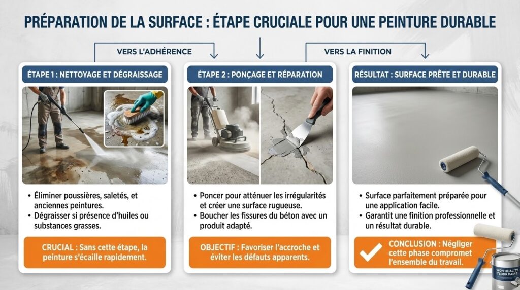 La préparation de la surface est une étape cruciale pour un rendu durable et homogène. Tout d’abord, il faut impérativement nettoyer le sol afin d’éliminer poussières, saletés, et traces d’anciennes peintures mal adhérentes. Un dégraissage peut être nécessaire si la surface présente des résidus d’huiles ou autres substances grasses. En réalité, sans cette étape, la peinture ne tiendra pas dans la durée et risque de s’écailler rapidement.
