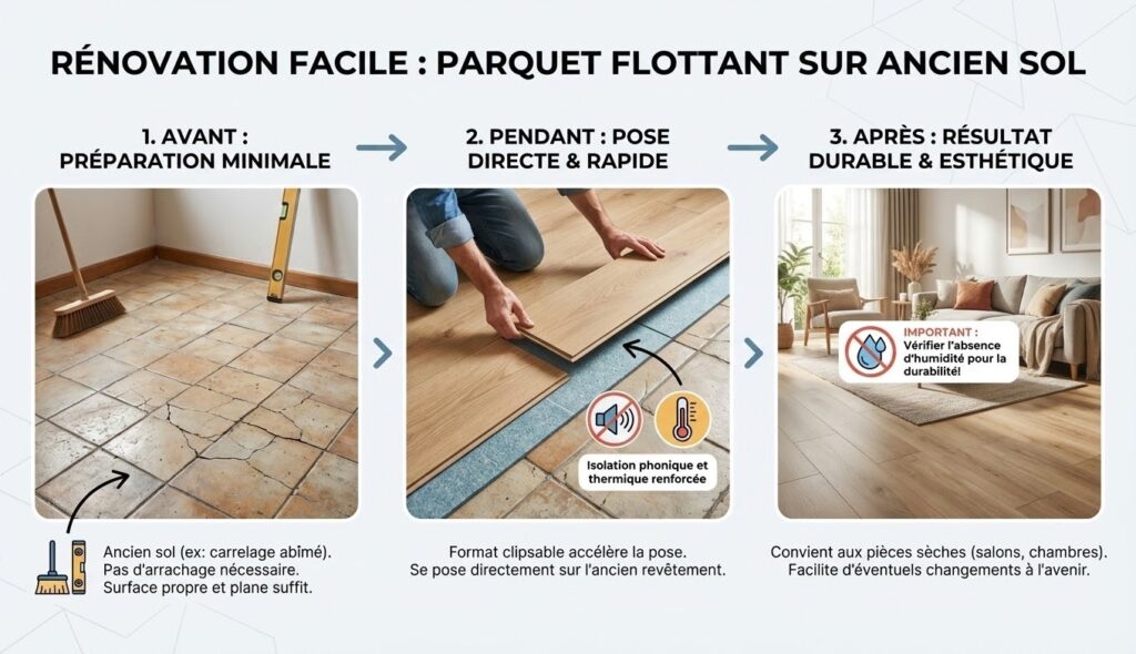 Par exemple, poser un parquet flottant sur un carrelage abîmé est courant. Il faut cependant vérifier l’absence d’humidité pour ne pas compromettre la durabilité. Ce type de revêtement convient aux pièces sèches comme les salons ou chambres. De plus, le format clipsable accélère la pose et facilite d’éventuels changements à l’avenir.