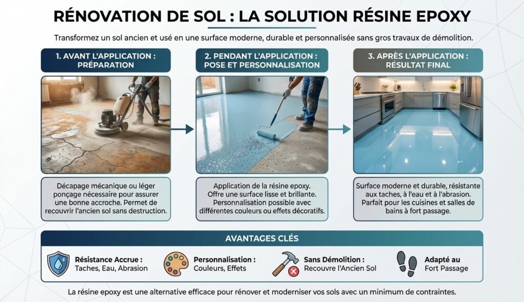 Avant l’application, un décapage mécanique ou un léger ponçage est nécessaire pour assurer une bonne accroche. Le résultat final résiste aux taches, à l’eau et à l’abrasion, ce qui convient parfaitement aux cuisines et salles de bains rénovées. Ainsi, la résine epoxy transforme un sol ancien, même irrégulier, en une surface moderne et durable.