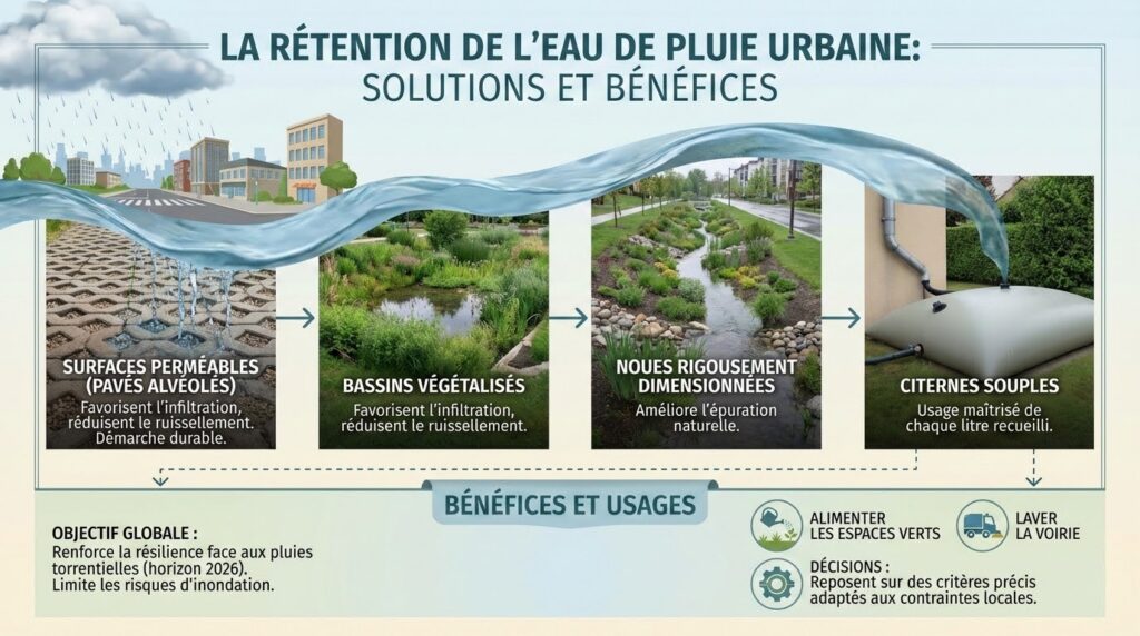 La rétention de l’eau de pluie limite les risques d’inondation dans les quartiers exposés. Différentes installations, comme les bassins végétalisés, favorisent l’infiltration et réduisent le ruissellement. Les surfaces perméables, notamment les pavés alvéolés, soutiennent cette démarche durable. Dans certaines zones, la mise en place de noues rigoureusement dimensionnées améliore l’épuration naturelle. Ces solutions renforcent la résilience des infrastructures face aux pluies torrentielles annoncées à l’horizon 2026.